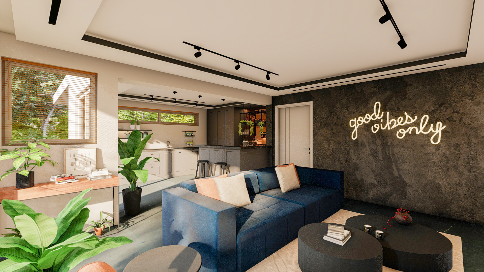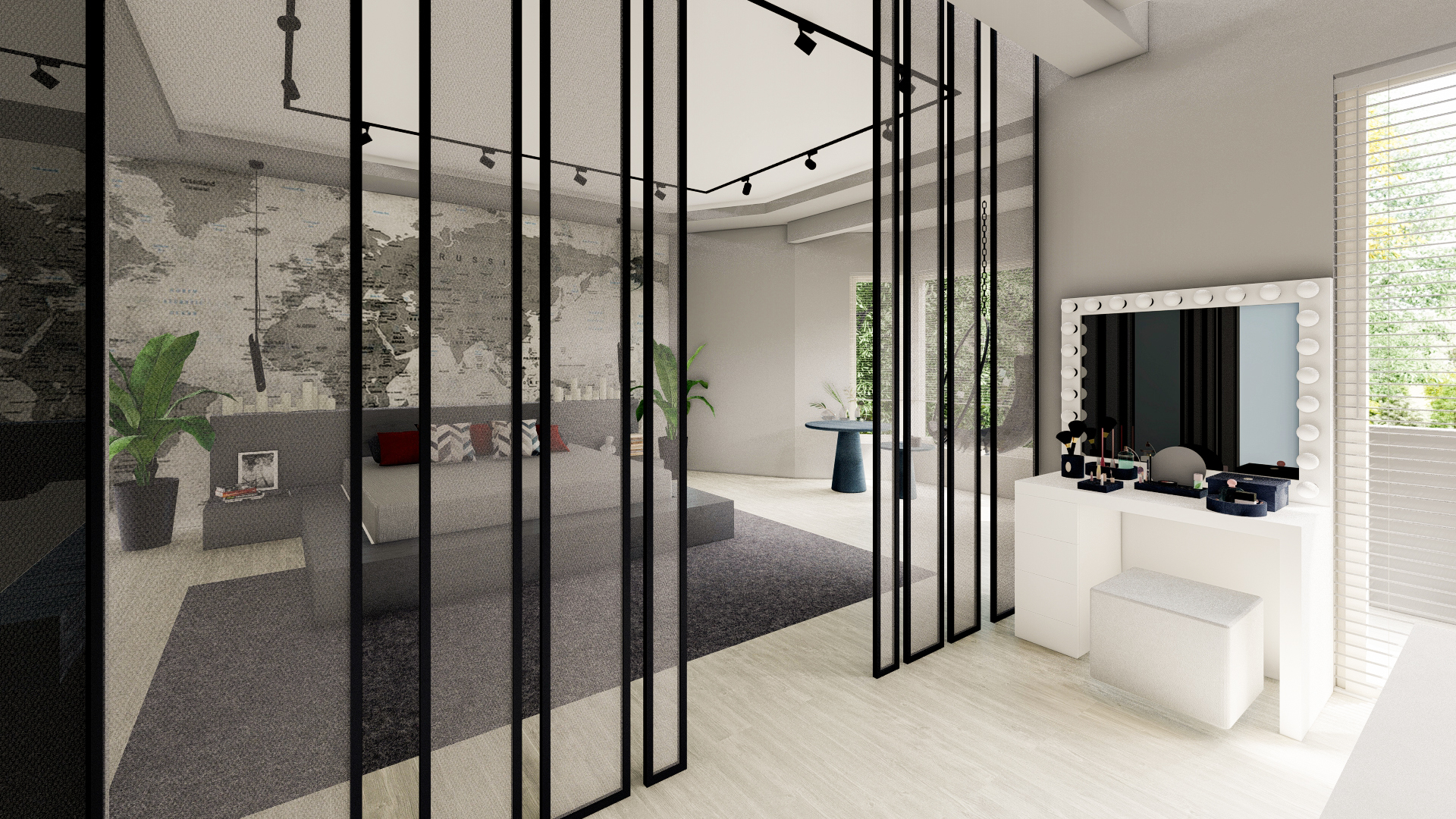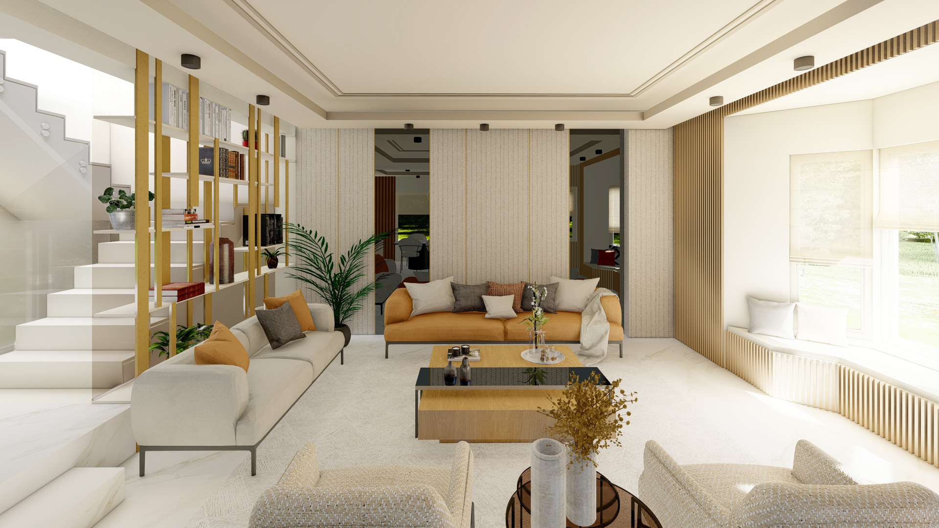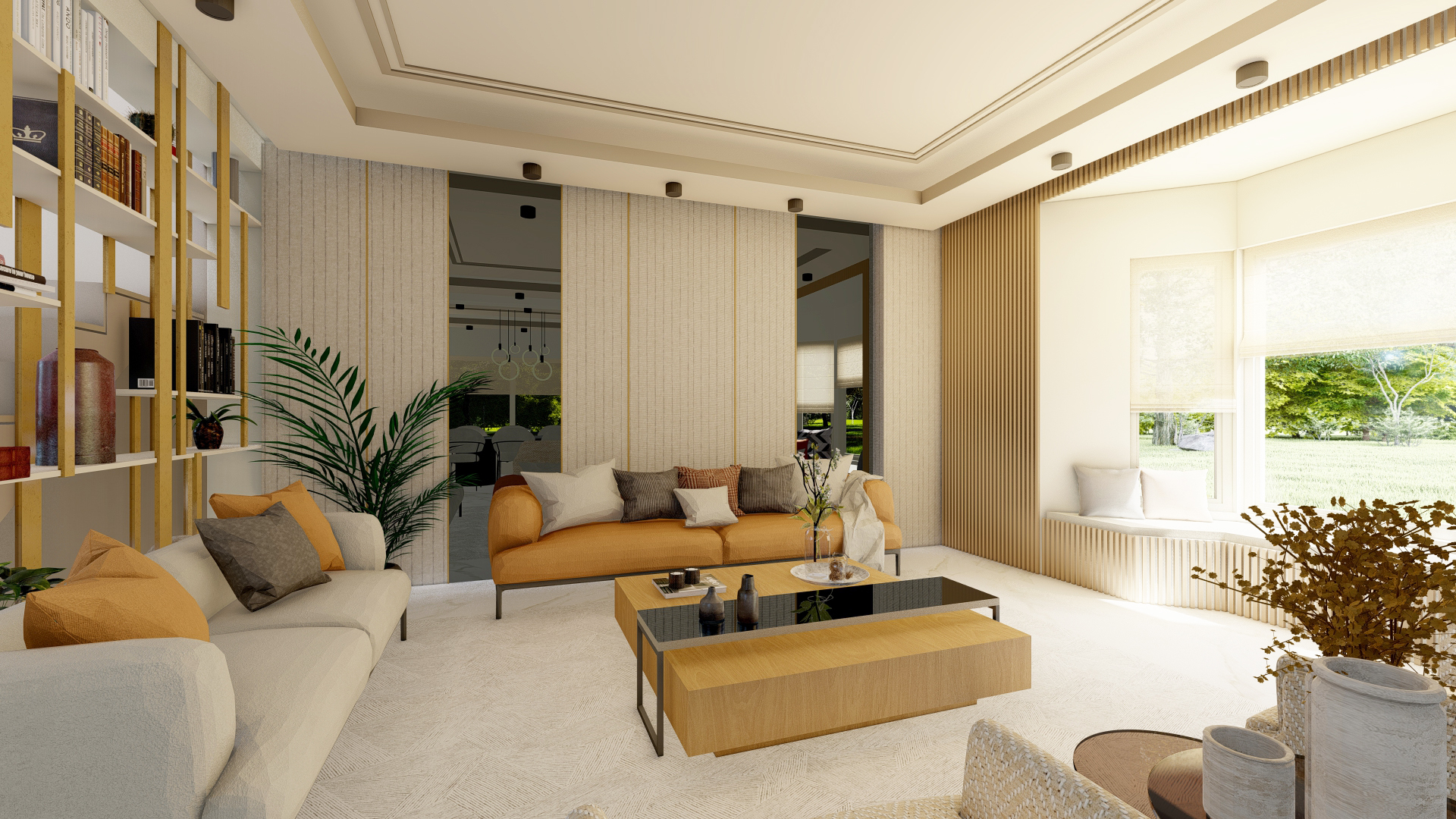 Denizli’de bulunan 3 katlı villanın tadilat iç mimari projesinde zemin katta bulunan salon, mutfak, giriş holü ve wc bölümlerinde ağırlıklı olarak açık renkler ve sıcak tonlar tercih edilmiştir. Bodrum katta bulunan yaşam alanı için koyu tonlar tercih edilmiş yeşil doku ile sakin bir ortam oluşturulmuştur ve mevcut açık mutfağın bir kısmı bar alanına çevrilmiştir. Gri tonların hakim olduğu yatak odasında özel bir yatak tasarlanmış ve arkası dünya haritası duvar kağıdı ile kaplanmıştır. Mevcut giyinme odası ile yatak bölümü yarı şeffaf bir seperatör ile ayrılmıştır. Camlı cumba önünde pileksi salıncak ile dinlenme ve okuma köşesi oluşturulmuştur.