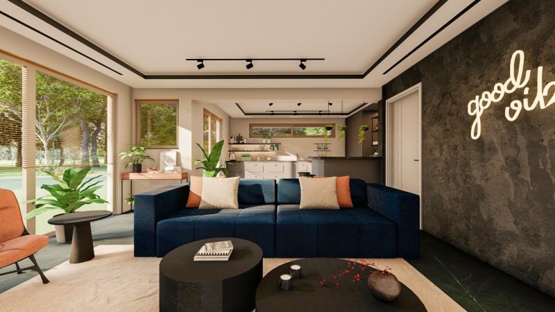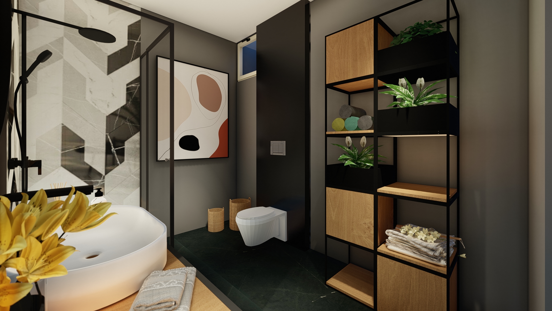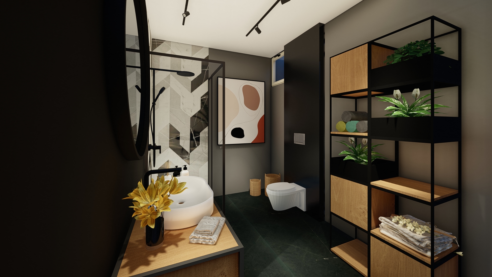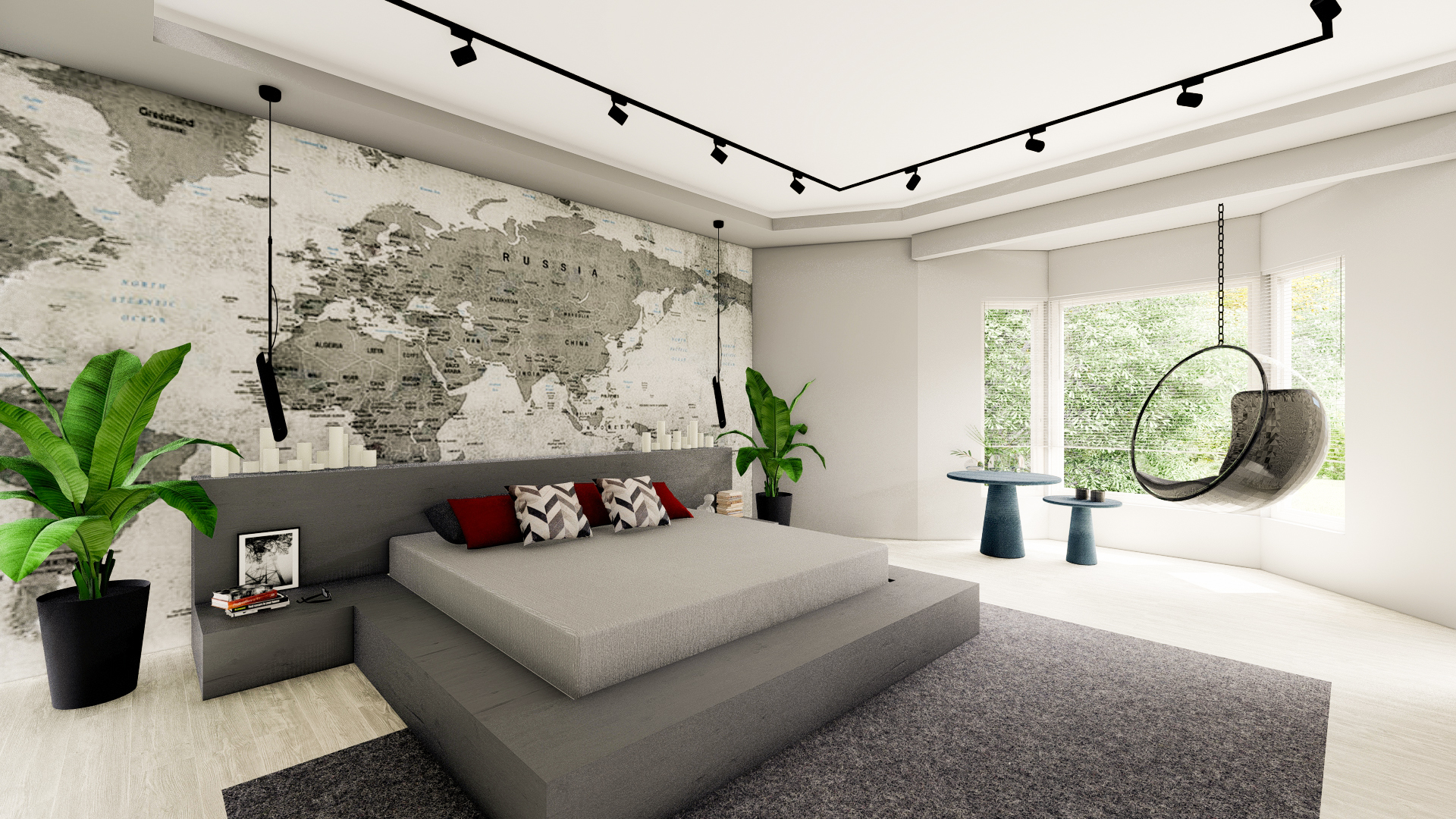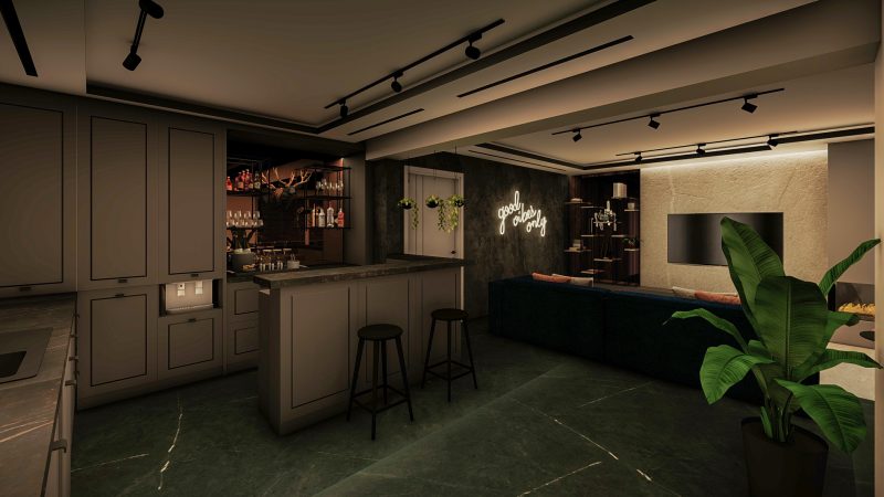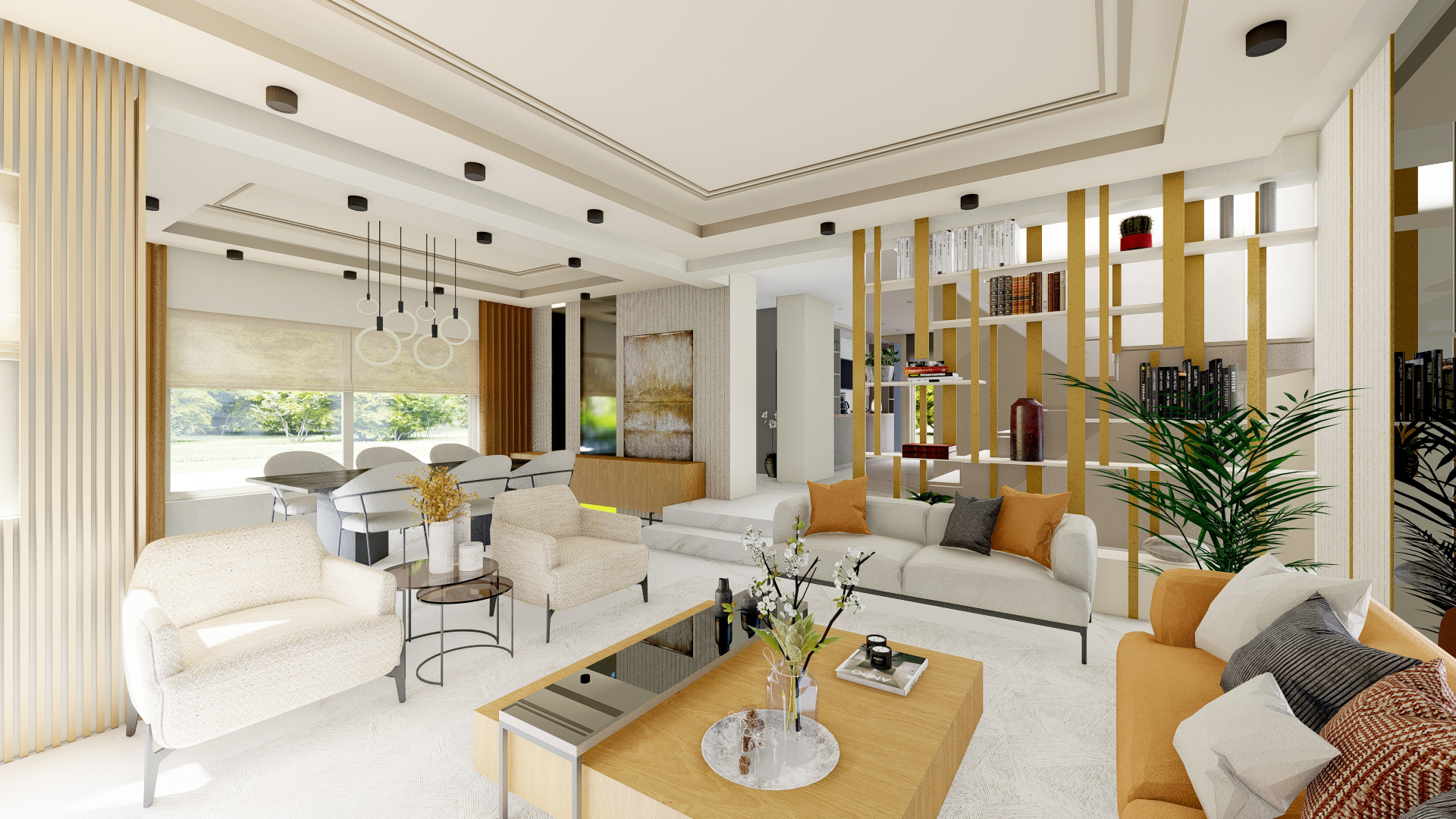 Denizli’de bulunan 3 katlı villanın tadilat iç mimari projesinde zemin katta bulunan salon, mutfak, giriş holü ve wc bölümlerinde ağırlıklı olarak açık renkler ve sıcak tonlar tercih edilmiştir. Bodrum katta bulunan yaşam alanı için koyu tonlar tercih edilmiş yeşil doku ile sakin bir ortam oluşturulmuştur ve mevcut açık mutfağın bir kısmı bar alanına çevrilmiştir. Gri tonların hakim olduğu yatak odasında özel bir yatak tasarlanmış ve arkası dünya haritası duvar kağıdı ile kaplanmıştır. Mevcut giyinme odası ile yatak bölümü yarı şeffaf bir seperatör ile ayrılmıştır. Camlı cumba önünde pileksi salıncak ile dinlenme ve okuma köşesi oluşturulmuştur.