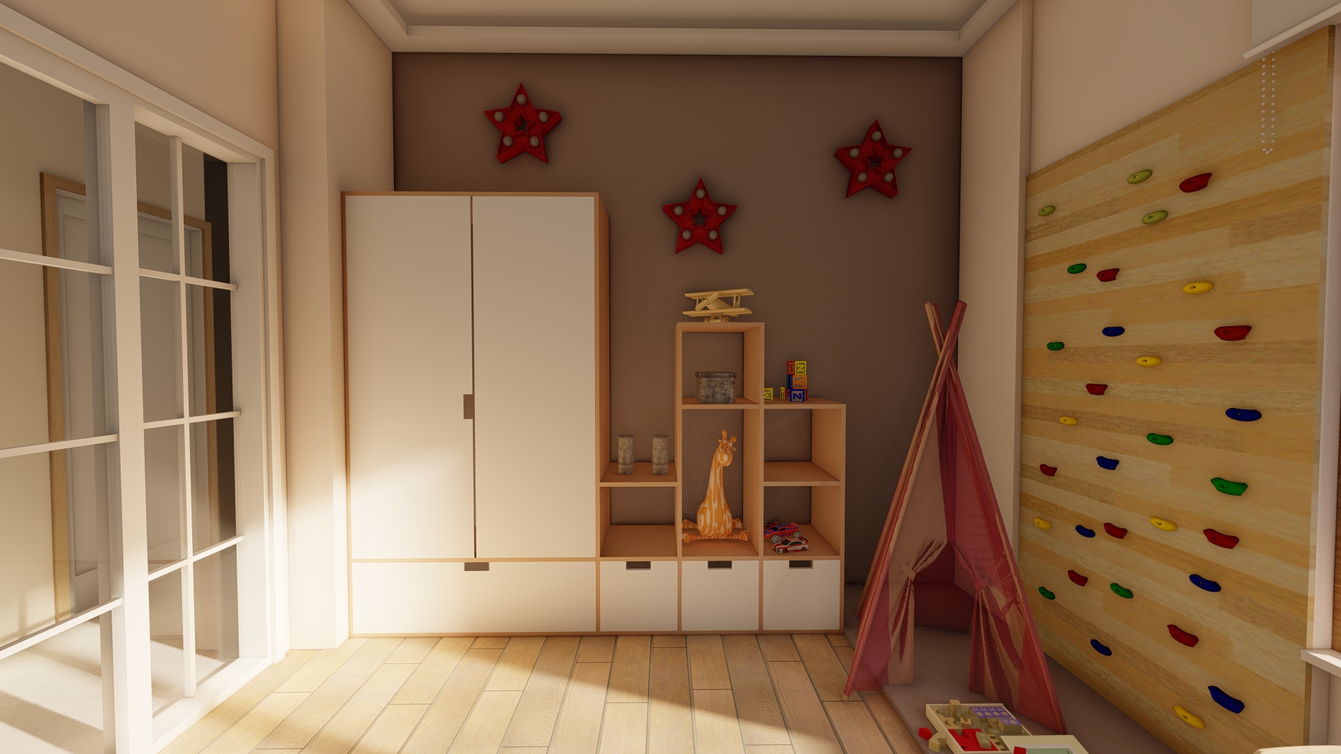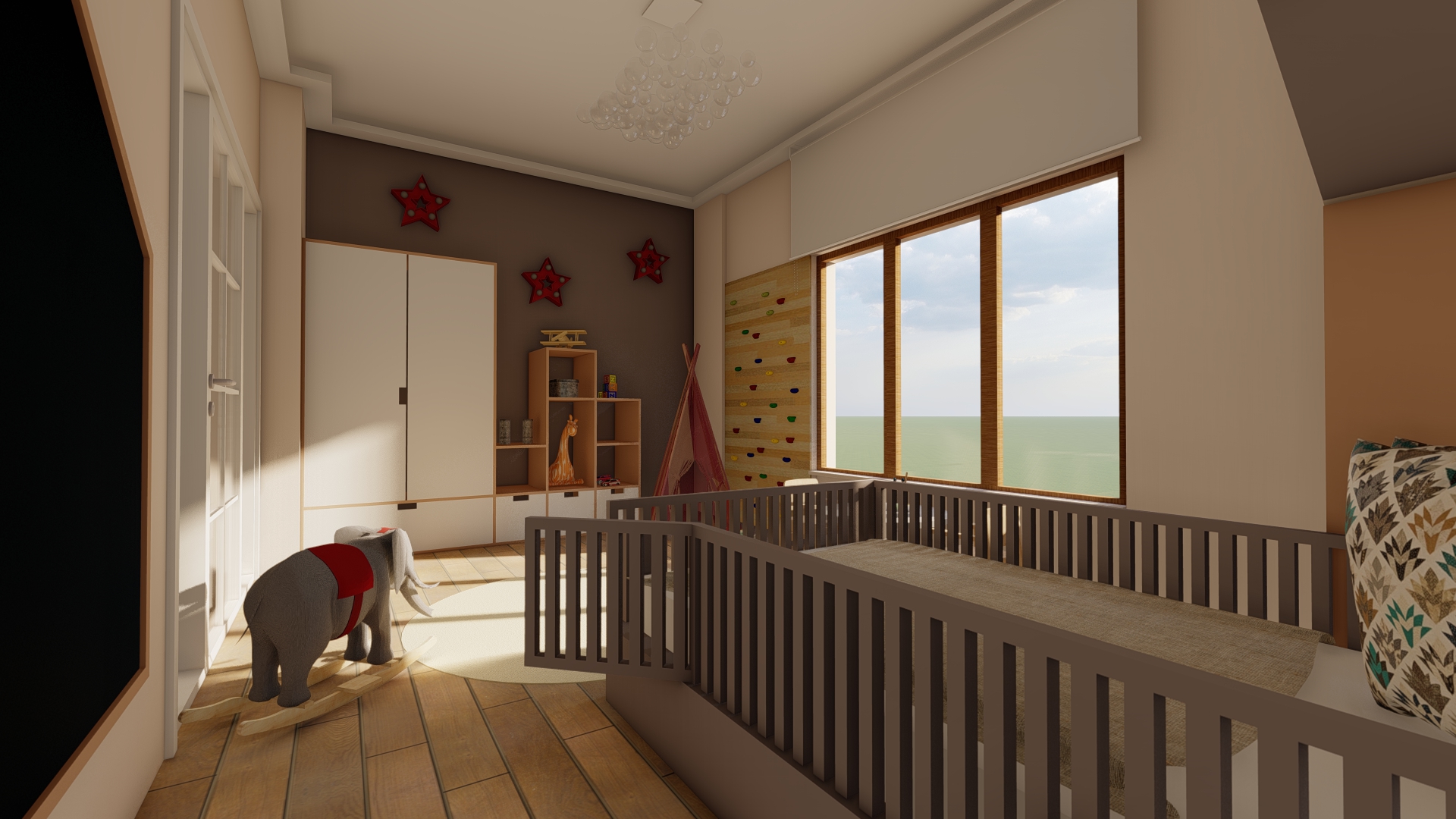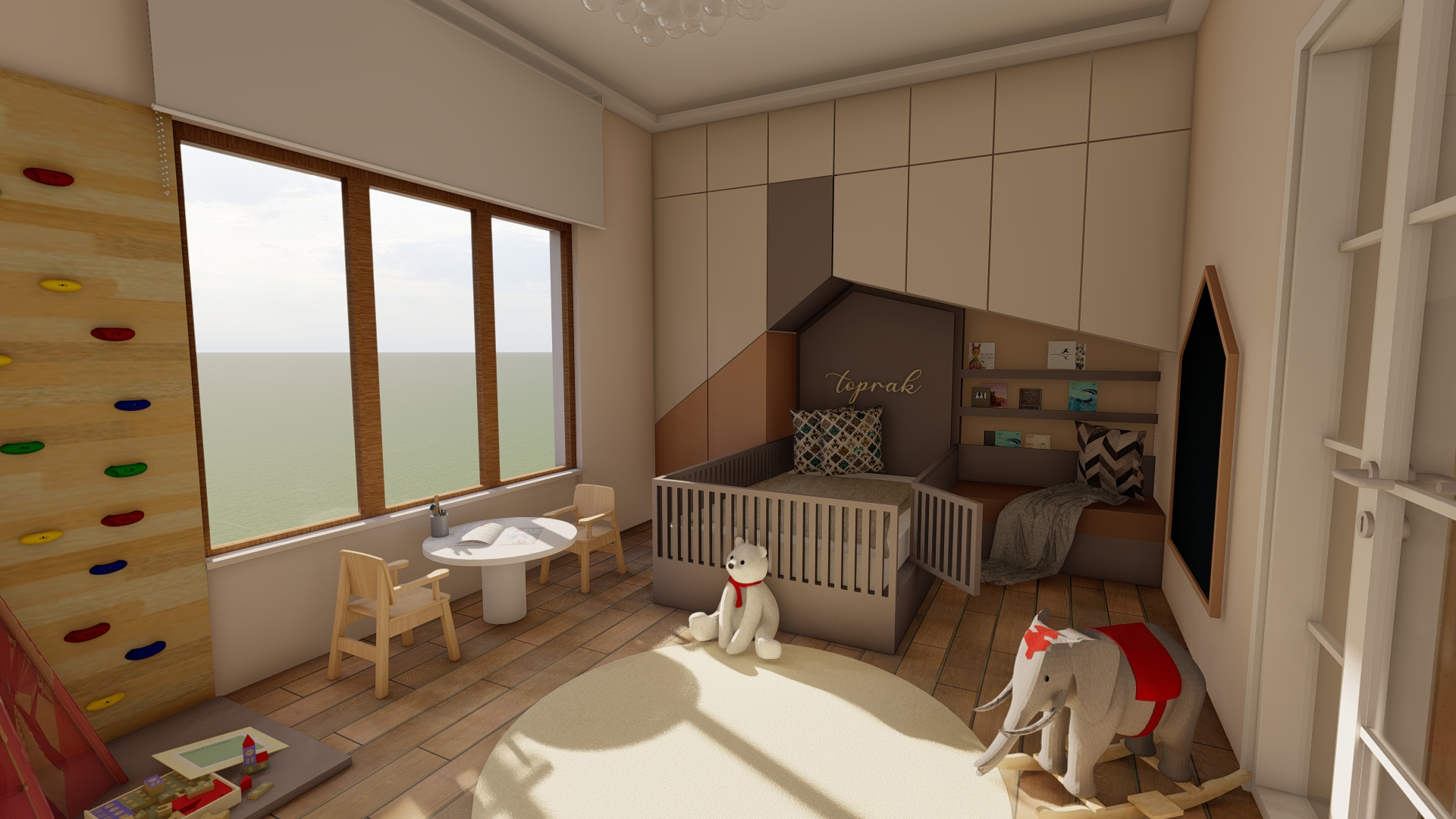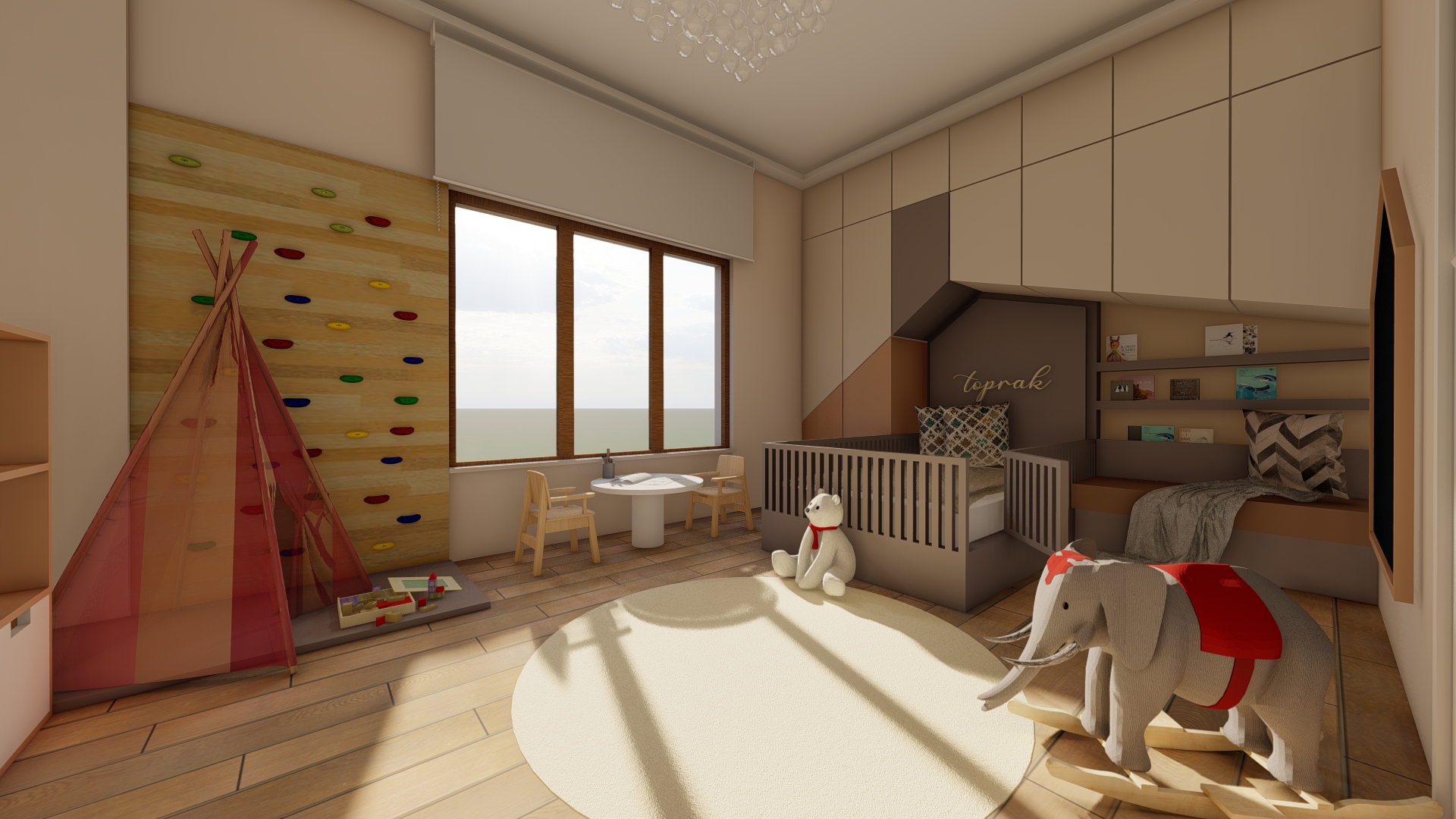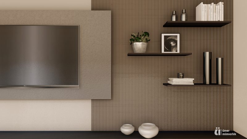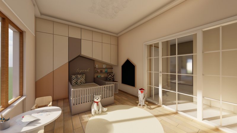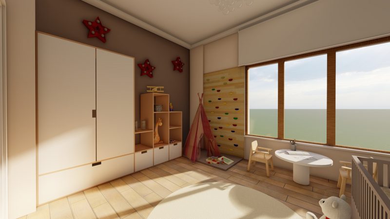 H-O evinin salonunda kullanıcıların günlük ev yaşantısı ve ihtiyaçları göz önüne alınarak modern, konforlu ve şık bir mekan yaratma kurgusu ön planda olmuştur. Tv ünitesi, kitaplık ve şömine ile birlikte kurgulanmış ahşap ve doğal taş görünümlü seramik uyum içinde kullanılmıştır. Çocuk odası için projede çocukların ihtiyaçları ve güvenliği göz önünde bulundurularak bir tasarım kurgusu oluşturulmuştur. Odanın tamamı özel üretim mobilyalardan oluşmaktadır. Yatak başlığında “montessori” yaklaşımı doğrultusunda çocuğun kendini güvende hissetmesi ve mekanı benimseyebilmesi açısından ev çatısı formu kullanılmıştır. Bu form gizli kapaklı dolap olarak tasarlanarak depolama ihtiyacını karşılaması hedeflenmiştir. Yatağın yanında çocuğun kendi kendine kitap okuma alışkanlığı kazanabilmesi düşünülerek kitaplık ve okuma köşesi tasarlanmıştır. Yatak ile karşılıklı konumlandırılan dolap ise çocuğun kendi başına ulaşabileceği ölçülerde kıyafet ve oyuncak dolabı olarak düşünülmüştür. Dolabın hemen yanındaki köşede ise çocukların oynarken motor becerelerini geliştirmesini destekleyecek bir tırmanma duvarı tasarlanmıştır.
